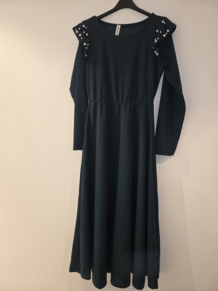 VESTIDO DE MANGA LARGA, CON DETALLE EN LA MANGA DE PEQUEÑAS PERLAS, CORTE EN LA CINTURA.